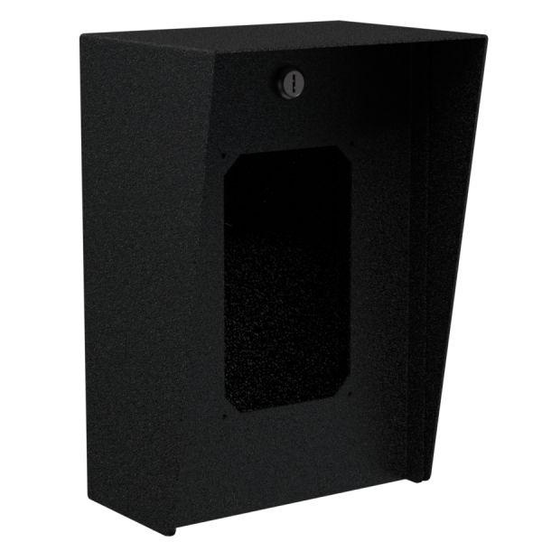 Protect and mount the Aiphone JV-DVF with this portrait-style enclosure. Made from 14-gauge steel and finished with a black wrinkle powder coat, it includes a 3" deep back box, center hole with knockouts, and weather-sealed gaskets. The overhang tapers from 3.5" to 1.75" for added moisture deflection. NEMA 4.x compatible for outdoor use.